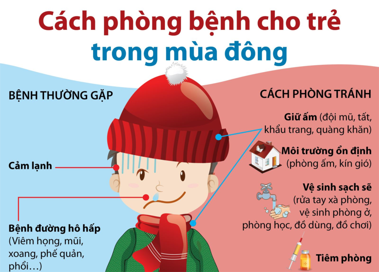 - Giữ ấm cơ thể khi thời tiết chuyển lạnh, ủ ấm cho trẻ khi đi xe máy, khi ra ngoài trời;cho trẻ mặc ấm, giữ ấm bàn chân, bàn tay, ngực, cổ, đầu;