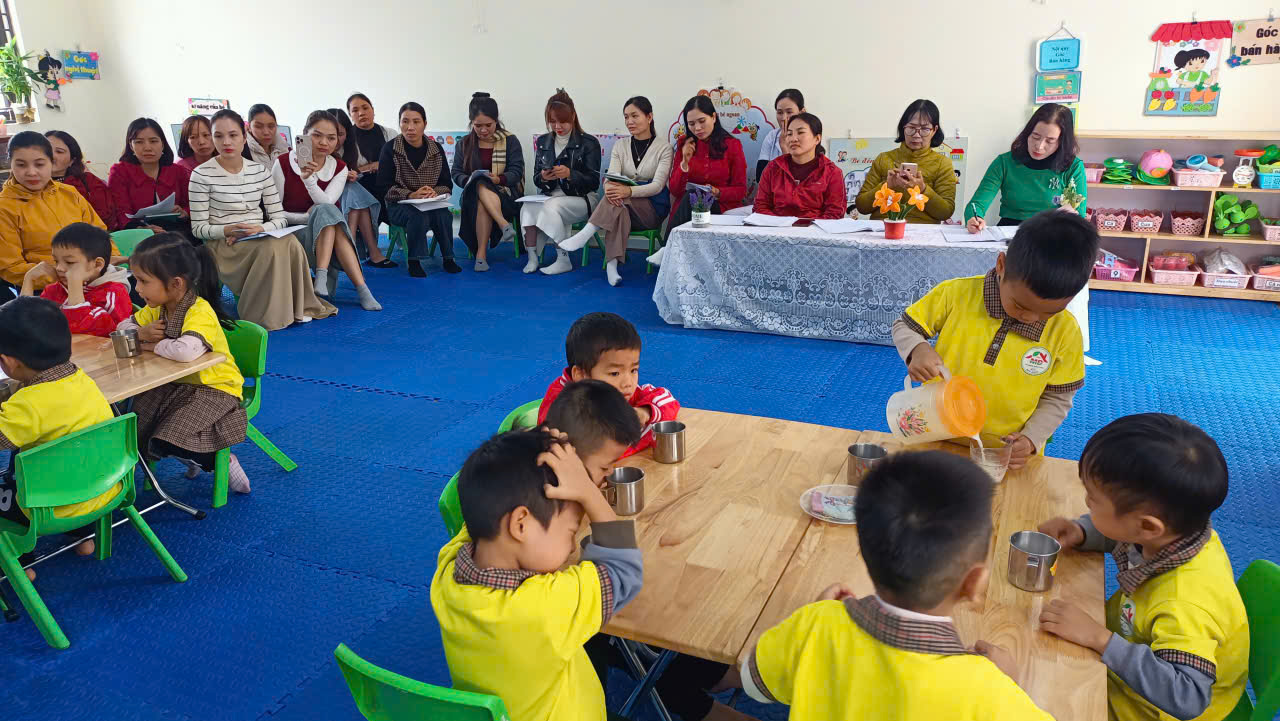 Tại chuyên đề, các hoạt động tổ chức cho trẻ uống sữa được triển khai trực tiếp, giúp trẻ làm quen với việc tự lấy sữa, chia sữa theo đúng định lượng, sử dụng dụng cụ chia sữa đúng cách, giữ gìn vệ sinh cá nhân, biết mời cô, mời bạn và hình thành nề nếp ăn uống văn minh, khoa học.