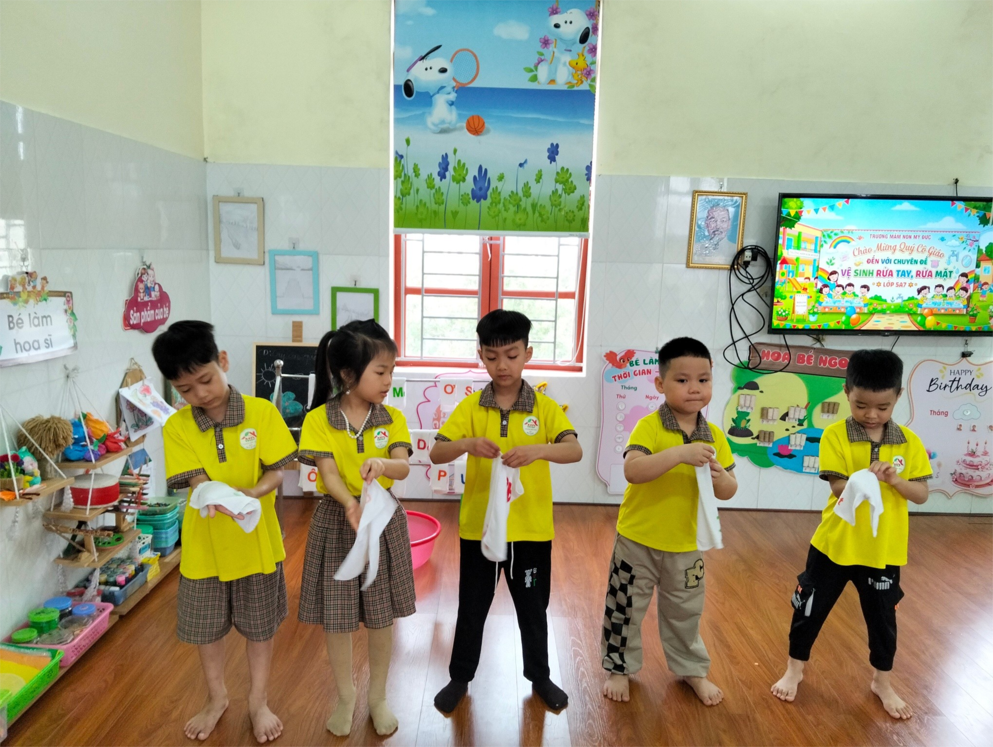 Trong buổi chuyên đề, các cô giáo đã hướng dẫn trẻ thực hành rửa mặt, rửa tay đúng cách. Thông qua các bài hát, trò chơi và hoạt động thực hành trực tiếp, trẻ không chỉ được học mà còn được trải nghiệm, từ đó ghi nhớ và hình thành thói quen tốt trong sinh hoạt hàng ngày.
