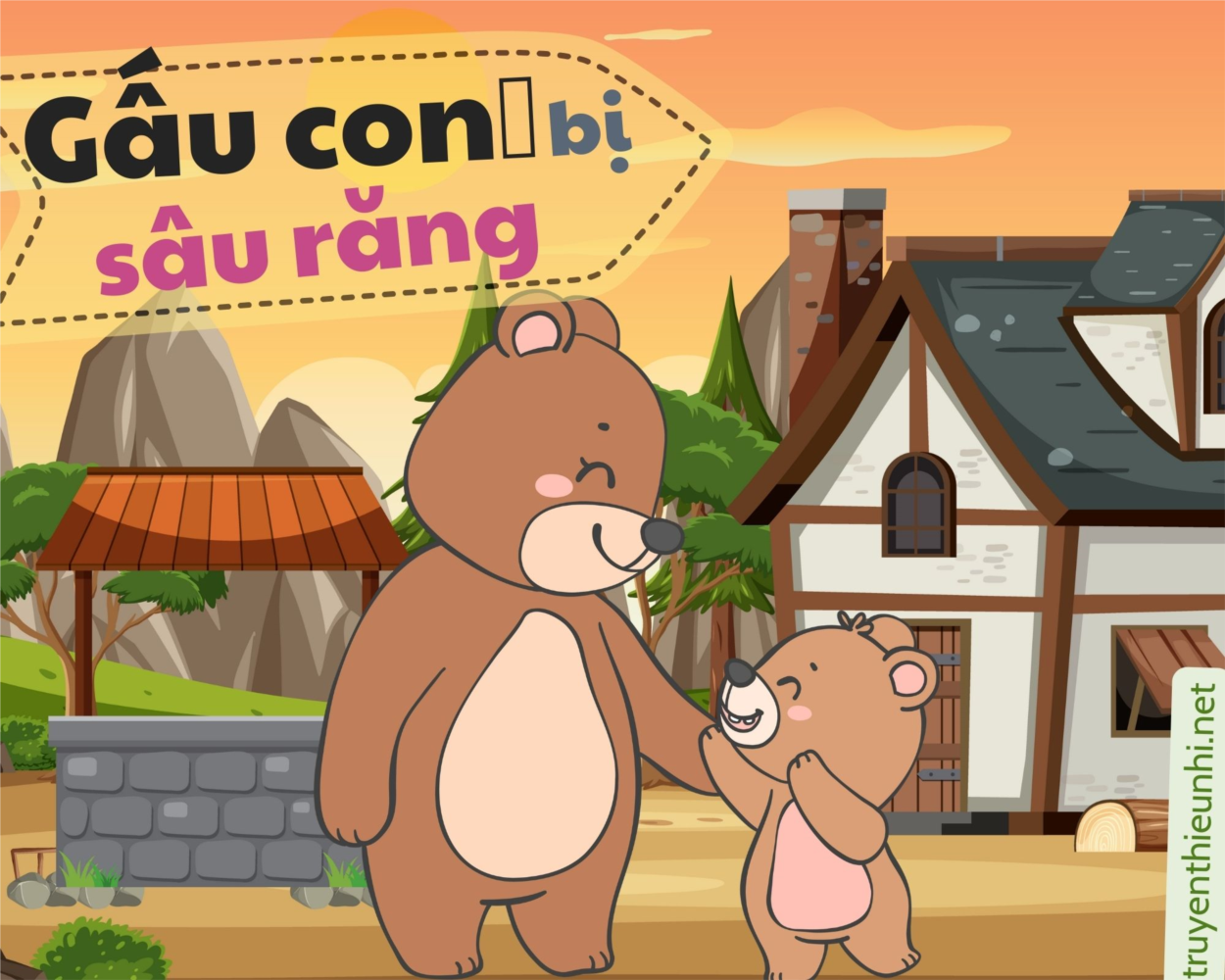 - Này Gấu Con, răng cháu sâu nhiều quá, phải chữa ngay thôi. Nếu để lâu sẽ bị sún hết đấy. Cháu nhớ là không nên ăn nhiều bánh kẹo, nhất là vào buổi tối. Hằng ngày, cháu phải đánh răng trước khi đi ngủ và sau khi ngủ dậy !