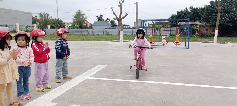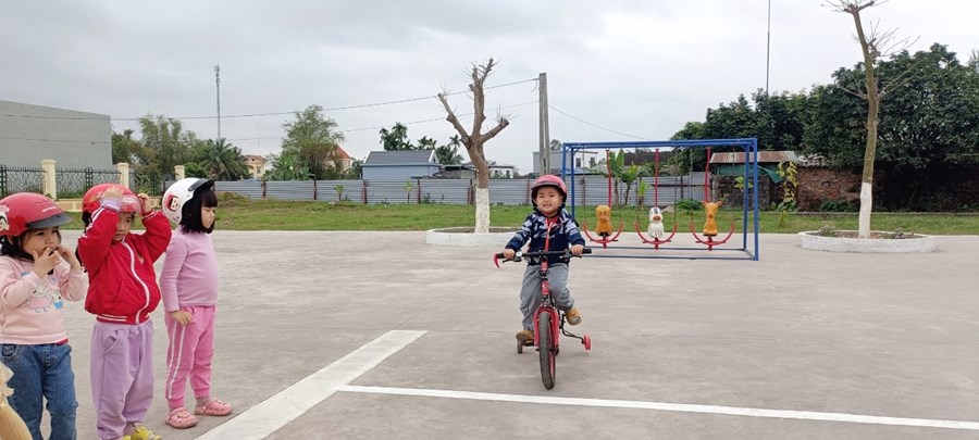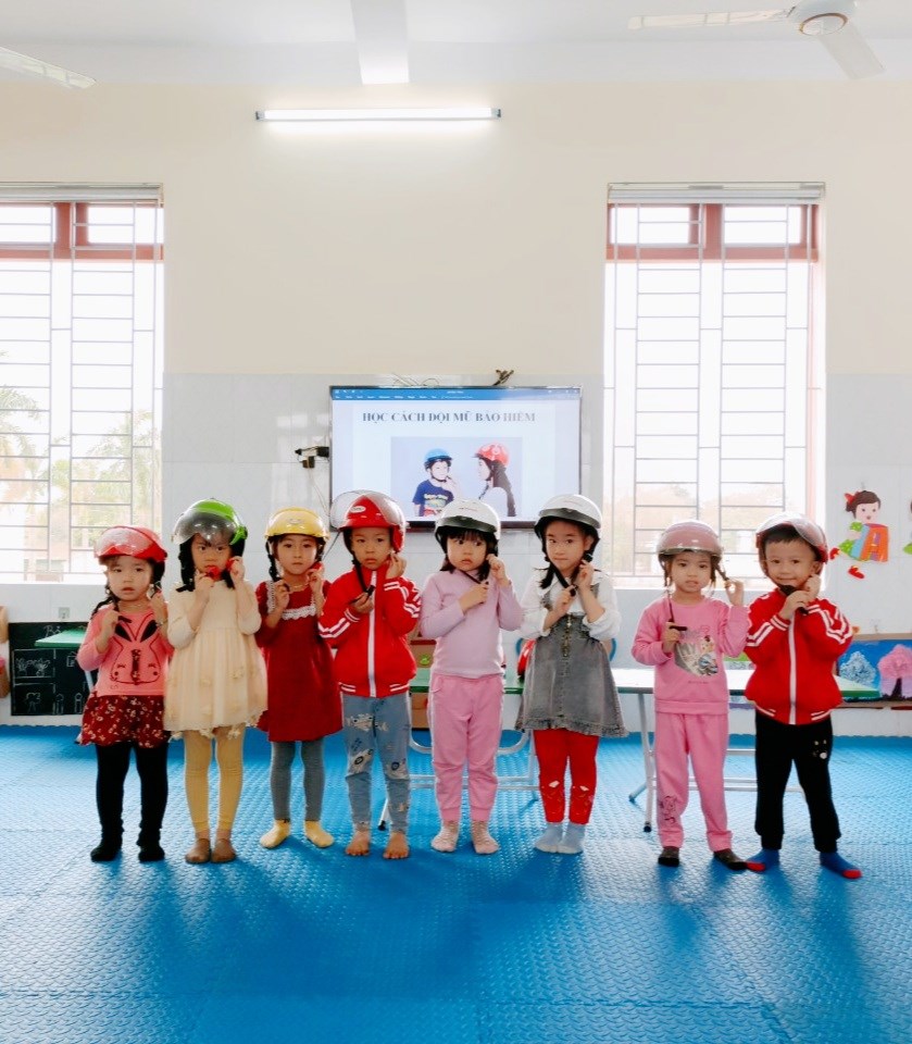 👉 Các con có thể cầm được mũ đội lên đầu và biết cách cài – mở quai mũ bảo hiểm