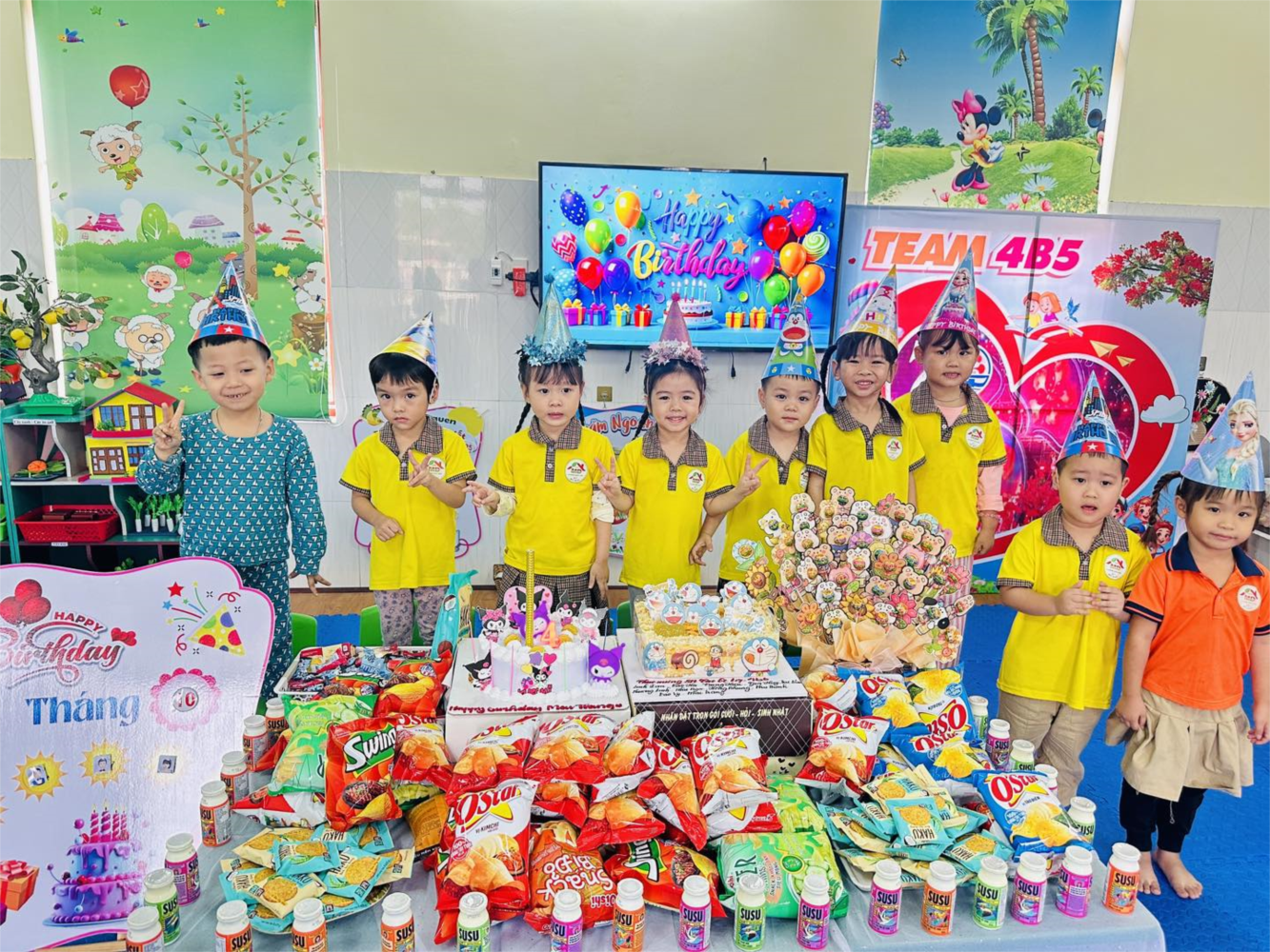 Lớp học 4B5 hôm nay rộn ràng tiếng cười và niềm vui khi các cô và các bé cùng tổ chức sinh nhật cho những bạn nhỏ có ngày sinh trong tháng.