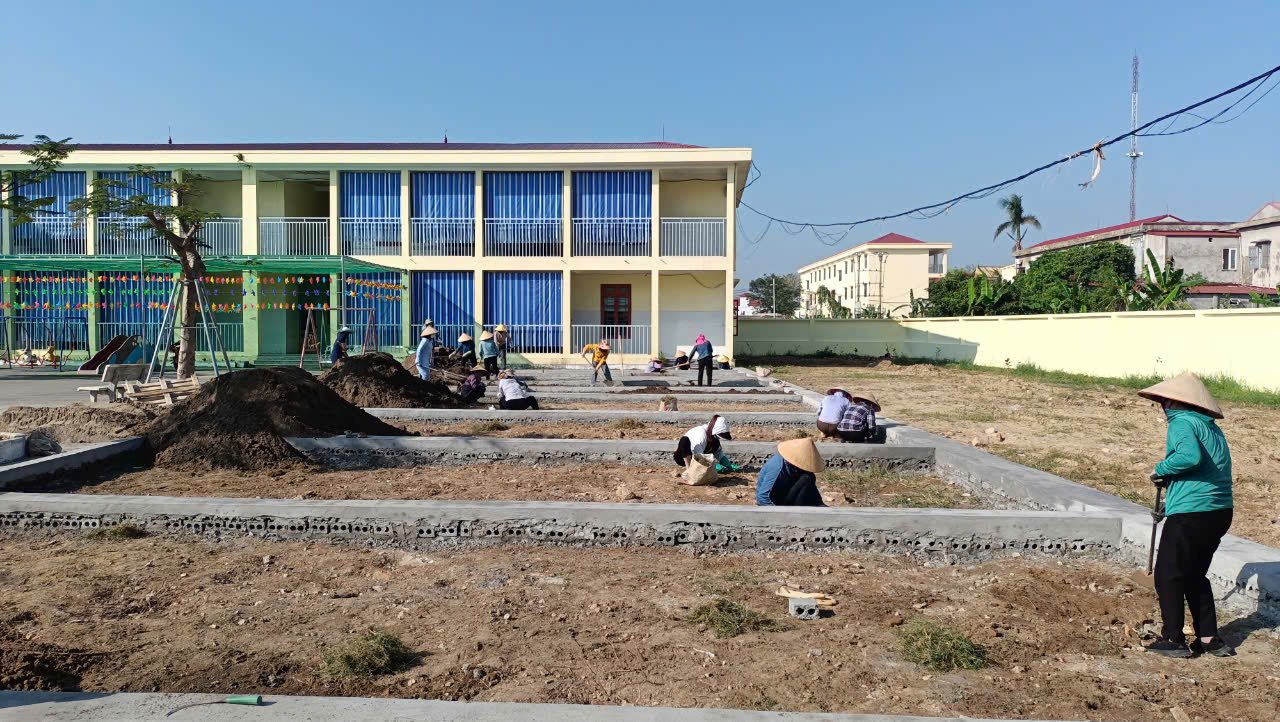 Thực hiện chỉ đạo của nhà trường, toàn thể cán bộ, giáo viên, nhân viên tham gia lao động trồng cây cải tạo môi trường, lao động nhổ cỏ, san đất, cuốc đất, trồng rau làm mô hình vườn rau sạch cho bé.