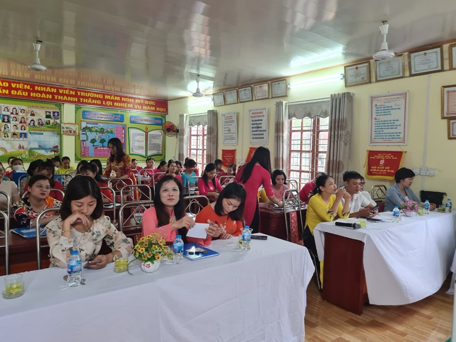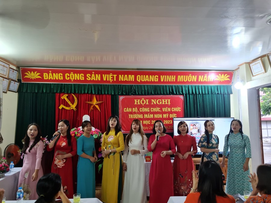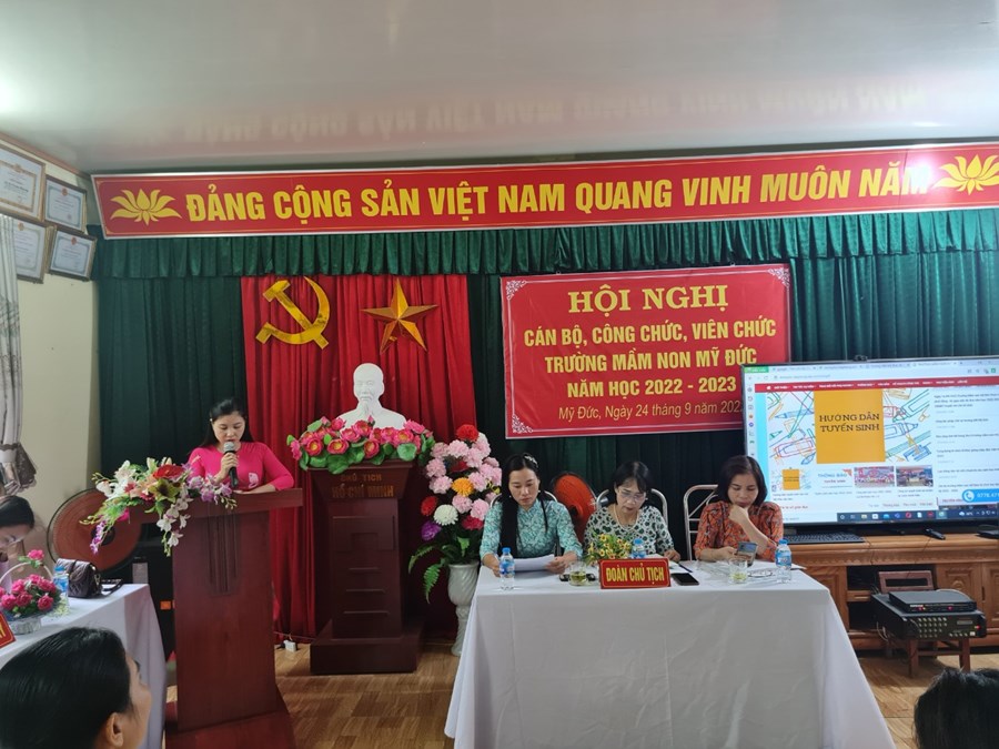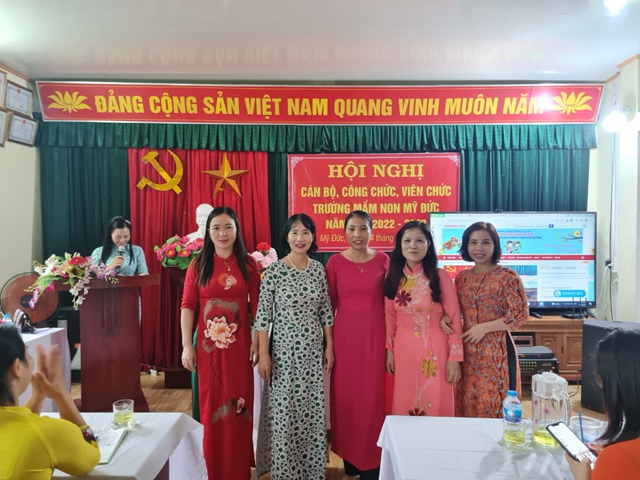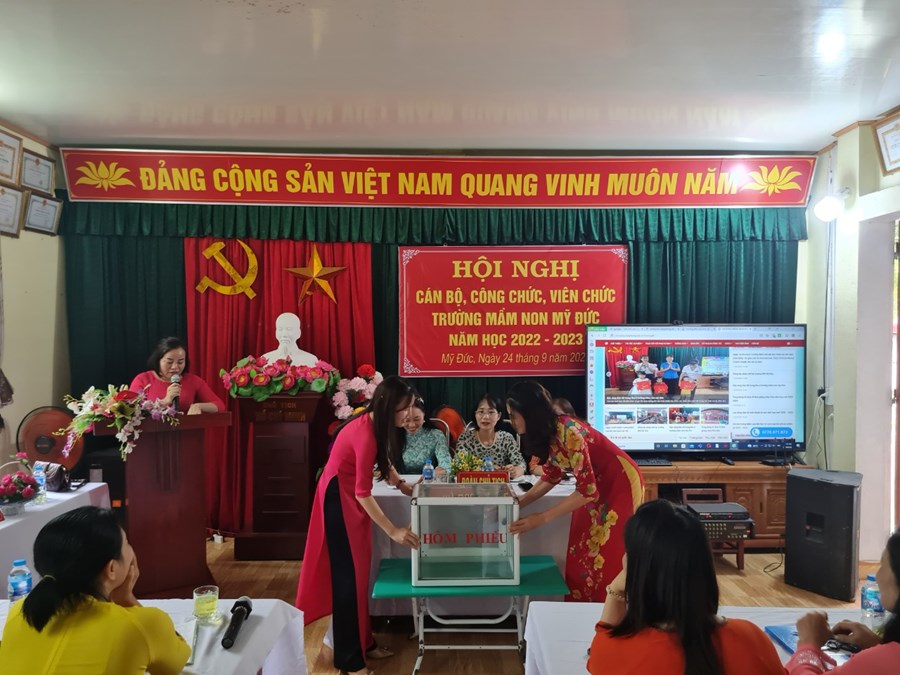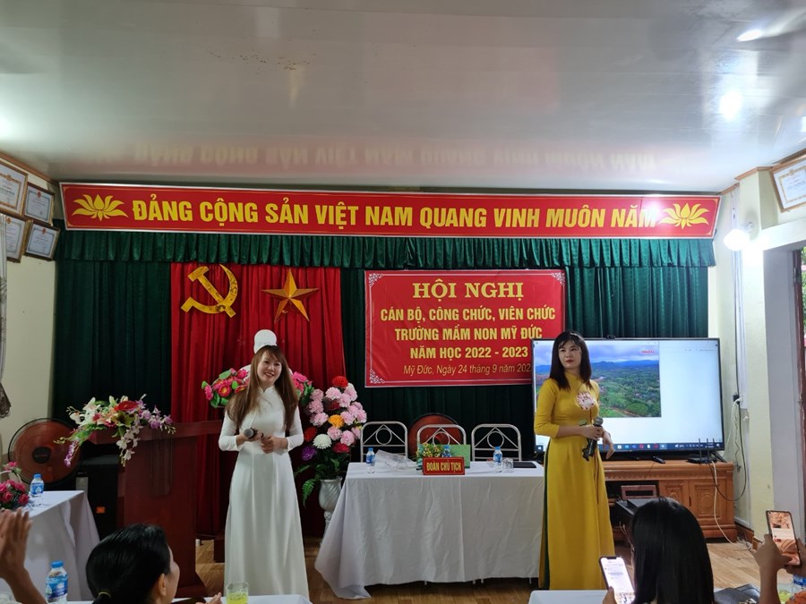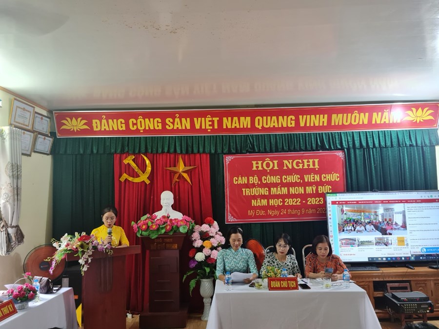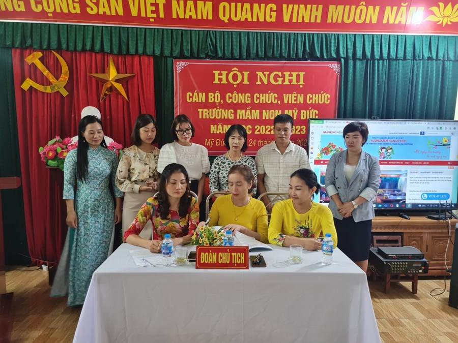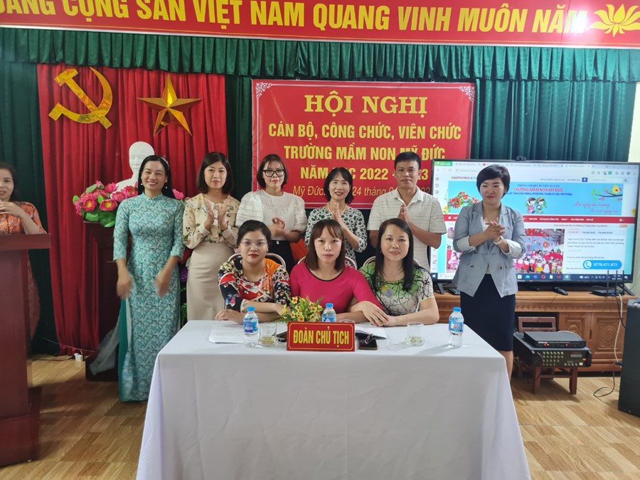 Trường Mầm non Mỹ Đức phối hợp với BCH Công đoàn trường tổ chức Hội nghị cán bộ, viên chức năm học 2022-2023 nhằm phát huy quyền làm chủ, tập hợp sức mạnh tập thể và năng lực sáng tạo của mỗi cán bộ, viên chức, và các tổ chức đoàn thể trong cơ quan, đơn vị nhằm thực hiện tốt nhiệm vụ năm học 2022 - 2023; xây dựng cơ quan, đơn vị trong sạch vững mạnh, đạt chuẩn văn hóa.