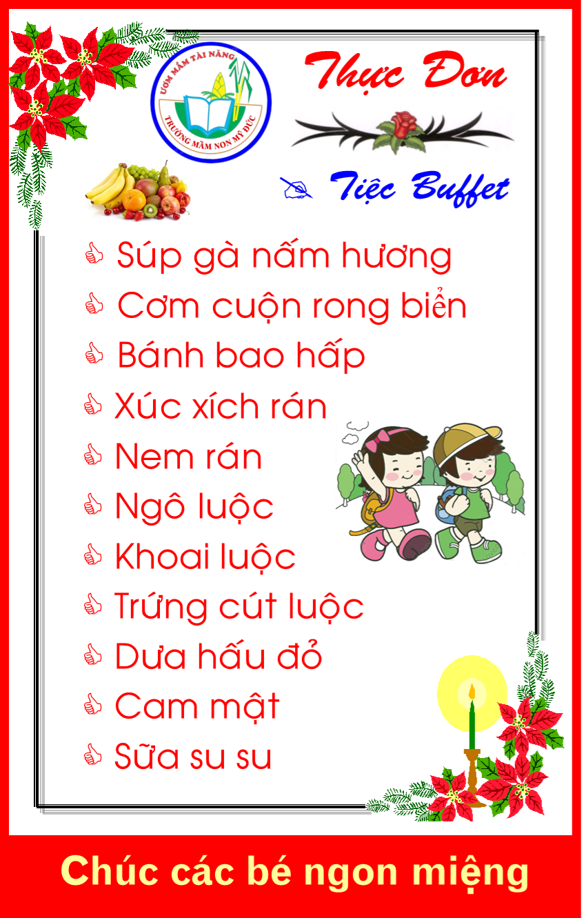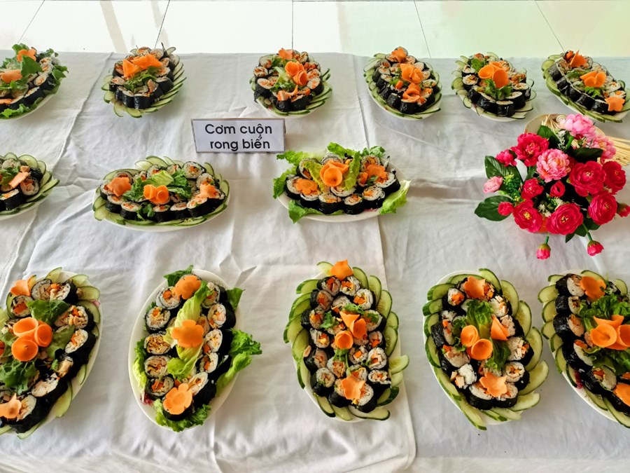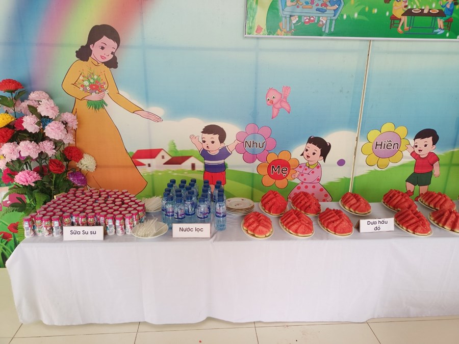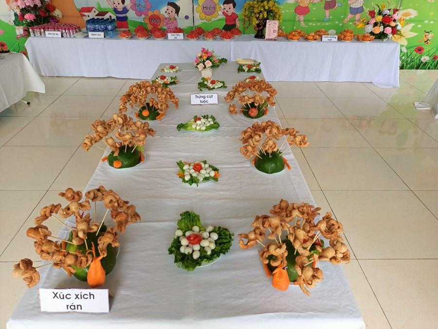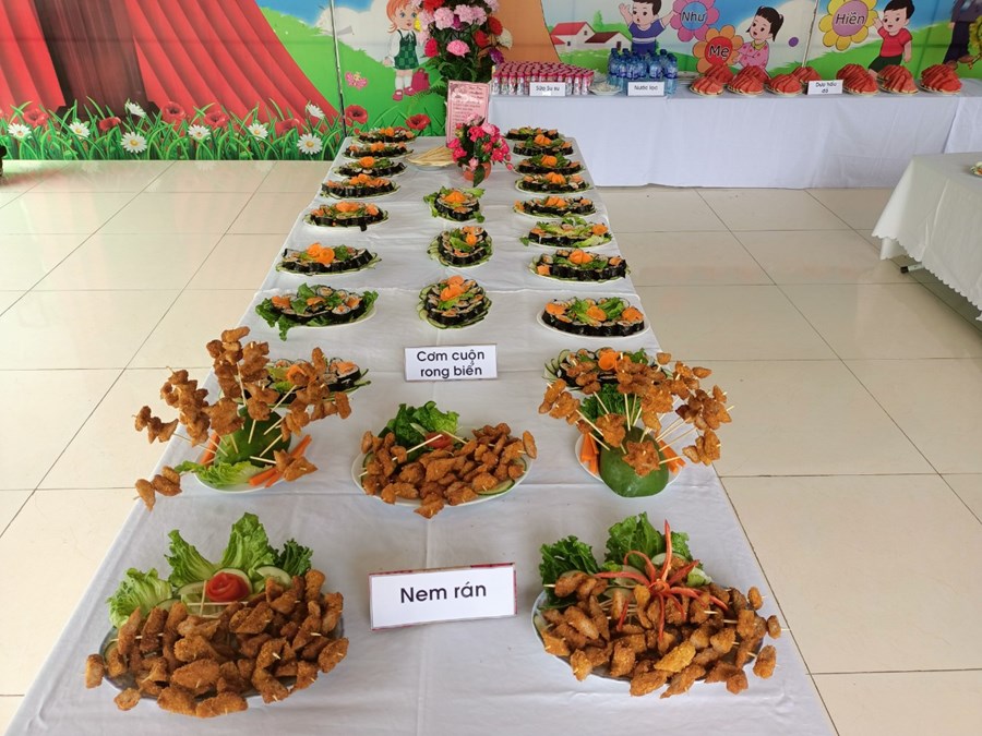 Để tổ chức bữa tiệc buffet cho các con, các cô giáo và các cô nuôi chuẩn bị từ rất sớm, bằng những đôi bàn tay khéo léo của mình các cô đã làm ra những món ăn rất ngon và đẹp mắt với thực đơn: