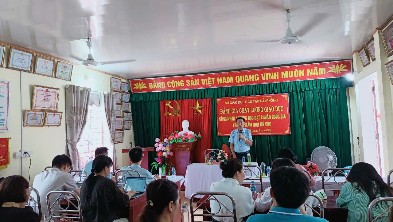 Chiều ngày 16/5 tại trường Mầm non Mỹ Đức huyện An Lão, đoàn khảo sát của sở giáo dục và đào tạo thành phố do đồng chí Phạm Quốc Hiệu - Phó giám đốc sở làm trưởng đoàn, các ông bà lãnh đạo, chuyên viên các phòng chuyên môn, nghiệp vụ, các ông bà là cộng tác viên của Sở GD&ĐT đã tiến hành đánh giá chất lượng giáo dục, xét công nhận trường Mầm non Mỹ Đức kiểm định chất lượng giáo dục cấp độ ba và đạt chuẩn quốc gia mức độ hai, cùng với sự có mặt của các đồng chí lãnh đạo phòng GD&ĐT huyện lãnh đạo, các đ/c lãnh đạo xã Mỹ Đức. Tại buổi làm việc, đoàn khảo sát đã tiến hành đánh giá 5 tiêu chuẩn của nhà trường. Qua đánh giá trường Mầm non Mỹ Đức đã đáp ứng tốt các tiêu chí đạt chuẩn, nhất là cơ sở vật chất và chất lượng giáo dục tuy nhiên còn nhiều điểm mạnh của nhà trường trong báo cáo tự đánh giá chưa được mô tả chi tiết rõ ràng theo đúng thực trạng hiện có, các phòng học chức năng đang trong quá trình xây dựng và hoàn thiện.