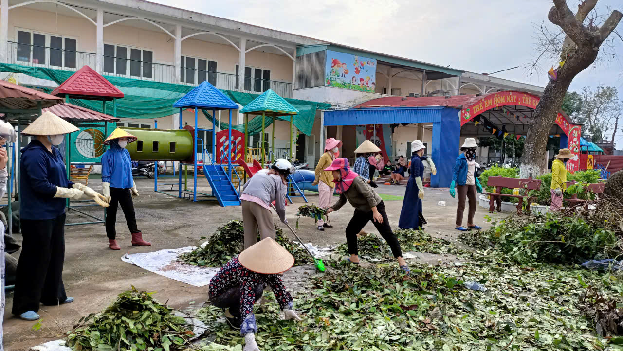 Trước tình hình đó, đồng chí hiệu trưởng đã huy động tập thể cán bộ, giáo viên, nhân viên của nhà trường ngay lập tức triển khai công tác khắc phục sau bão. Bất chấp những khó khăn về thời tiết, các cô giáo đã chung tay góp sức, khẩn trương bắt tay vào dọn dẹp khuôn viên trường học. Từng cành cây gãy đổ đã được thu gom, những thanh sắt bị sập đổ cũng được di dời, và các khu vực ảnh hưởng được làm sạch một cách nhanh chóng và an toàn.