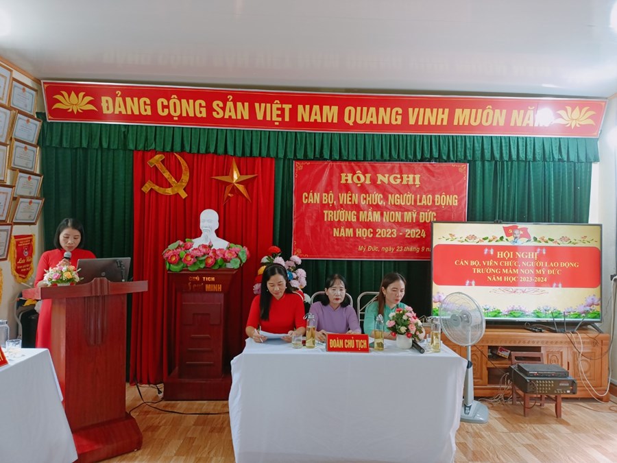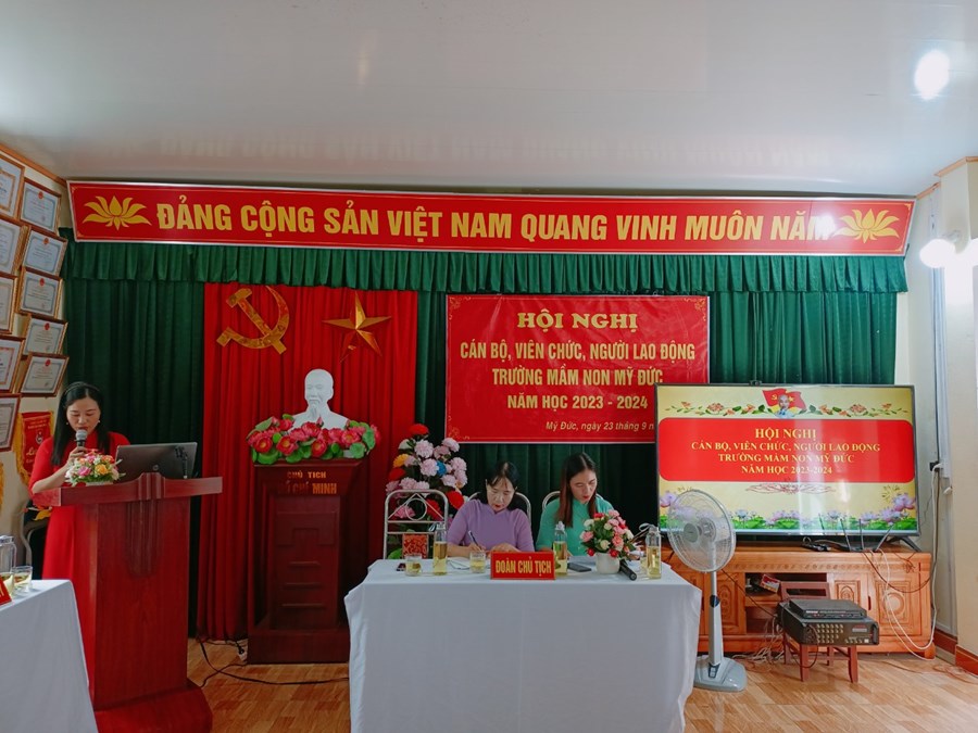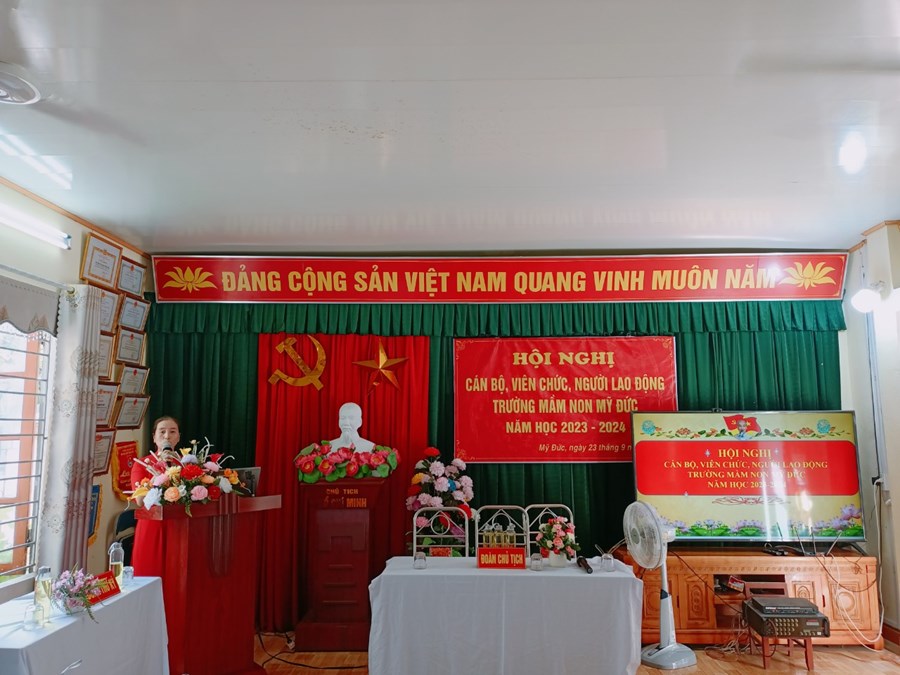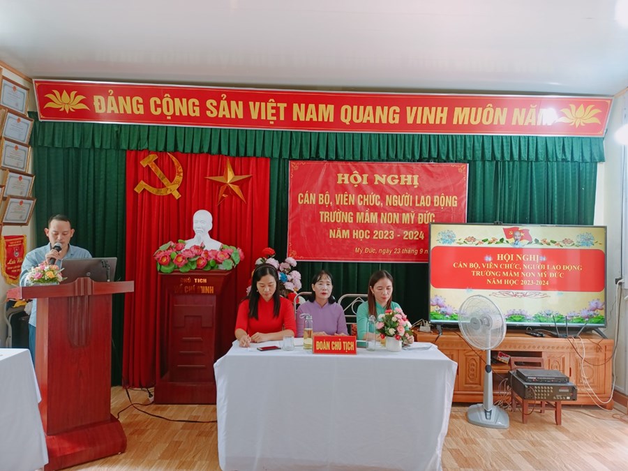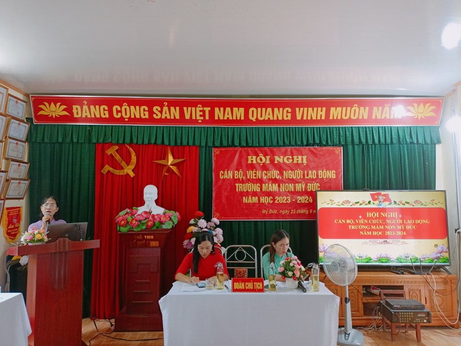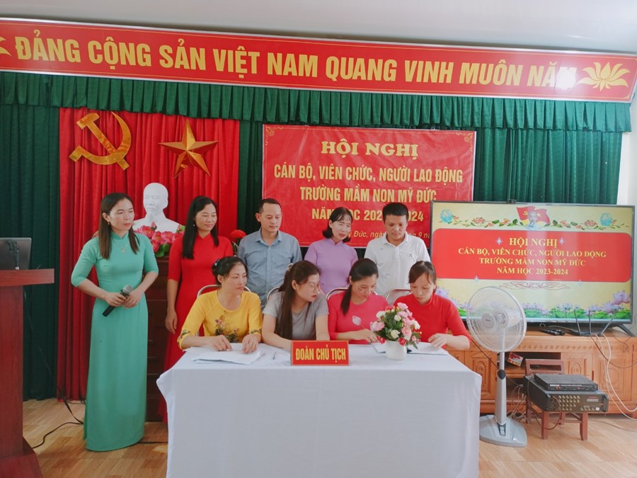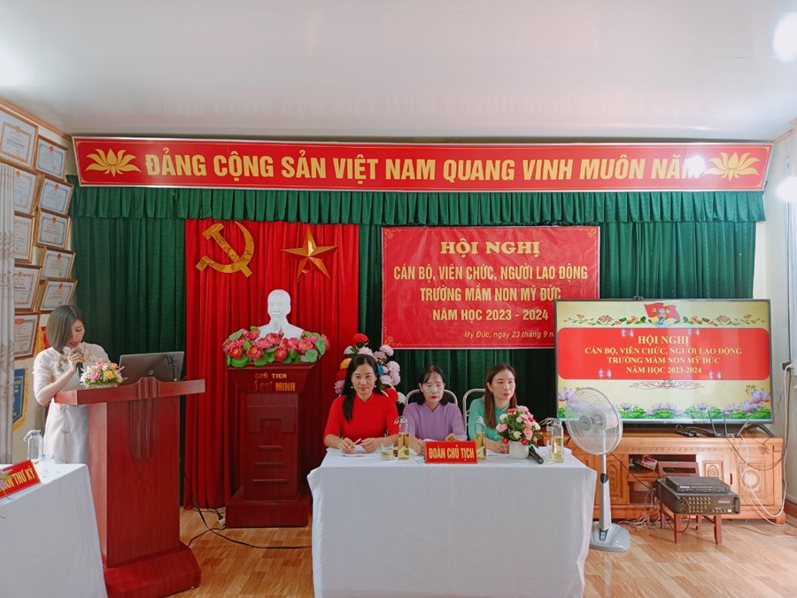 Trường Mầm non Mỹ Đức phối hợp với BCH Công đoàn nhà trường tổ chức Hội nghị cán bộ, viên chức, người lao động năm học 2023-2024 nhằm phát huy quyền làm chủ, tập hợp sức mạnh tập thể và năng lực sáng tạo của mỗi cán bộ, viên chức, người lao động, các tổ chức đoàn thể trong cơ quan, đơn vị nhằm thực hiện tốt nhiệm vụ năm học 2023 - 2024; xây dựng cơ quan, đơn vị trong sạch vững mạnh, đạt chuẩn văn hóa.