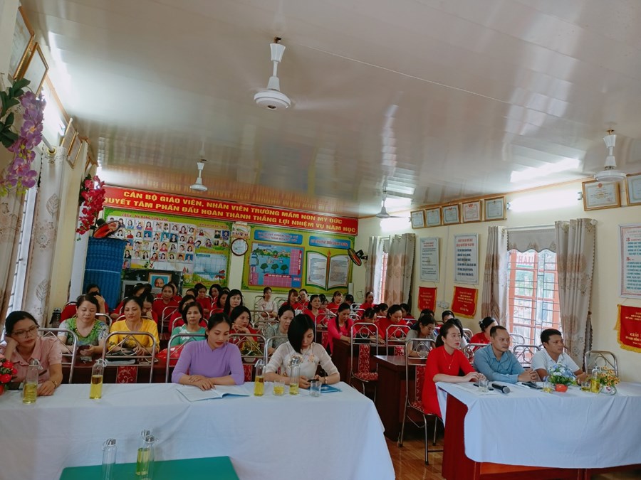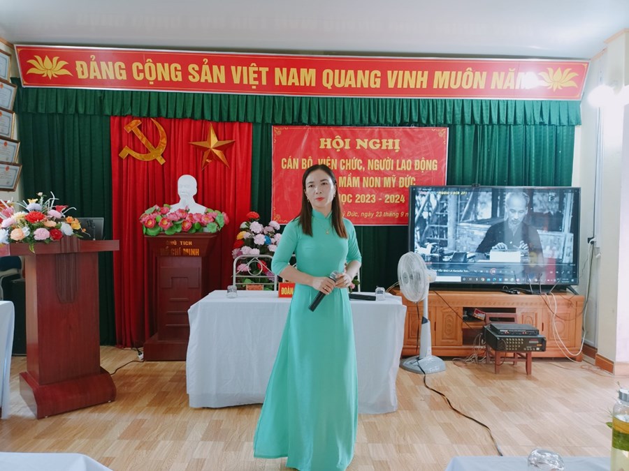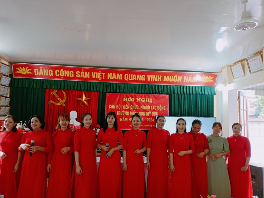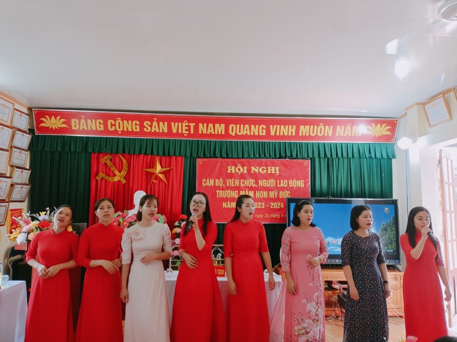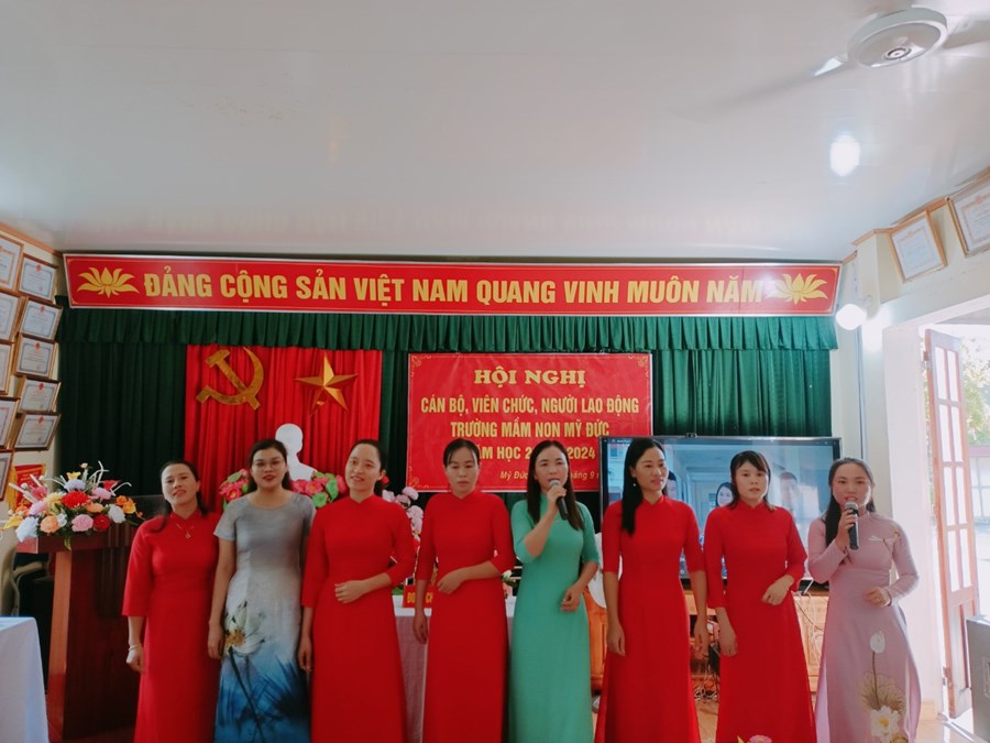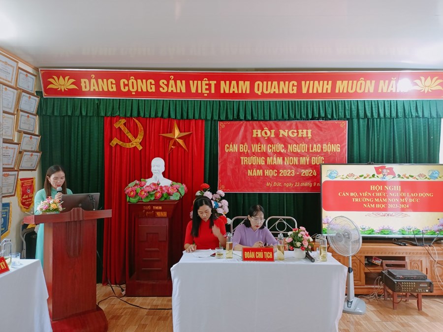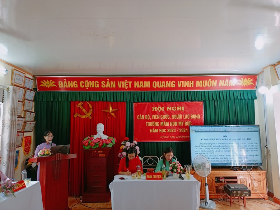 Trường Mầm non Mỹ Đức phối hợp với BCH Công đoàn nhà trường tổ chức Hội nghị cán bộ, viên chức, người lao động năm học 2023-2024 nhằm phát huy quyền làm chủ, tập hợp sức mạnh tập thể và năng lực sáng tạo của mỗi cán bộ, viên chức, người lao động, các tổ chức đoàn thể trong cơ quan, đơn vị nhằm thực hiện tốt nhiệm vụ năm học 2023 - 2024; xây dựng cơ quan, đơn vị trong sạch vững mạnh, đạt chuẩn văn hóa.